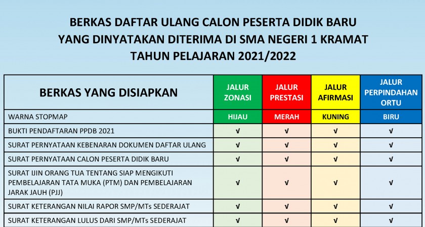 Selamat kami ucapkan kepada Calon Peserta Didik (CPD) yang dinyatan diterima di SMA Negeri 1 kramat. CPD yang dinyatakan diterima di SMA Negeri 1 Kramat wajib melakukan Daftar Ulang pad