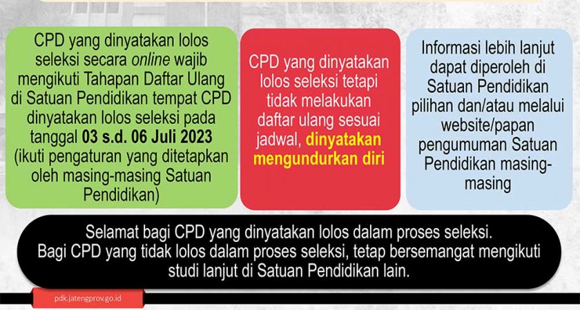 Selamat kami ucapkan kepada Calon Peserta Didik (CPD) yang dinyatan diterima di SMA Negeri 1 kramat. CPD yang dinyatakan diterima di SMA Negeri 1 Kramat wajib melakukan Daftar Ulang pada tanggal 3 sampai dengan 6 Juli 2023, bagi CPD yang tdak melaksanakan Daftar Ulang dinyatakan mengundurkan diri. Adapun bagi CPD yang akan melaksanakn daftar ulang diharapkan membawa berkas sesuai dengan jalurnya. Untuk berkas yang harus dibawa saat daftar ulang bisa di lihat pada file Lembar Daftar Ulang CPD 2023 yang bisa didownload pada link https://s.id/smakramatppdb2023. semua berkas disatukan dalam sebuah stopmap dengan ketentuan Zonasi (HIJAU), Afirmasi (KUNING), Perpindahan Orang Tua (BIRU), dan Prestasi (MERAH).